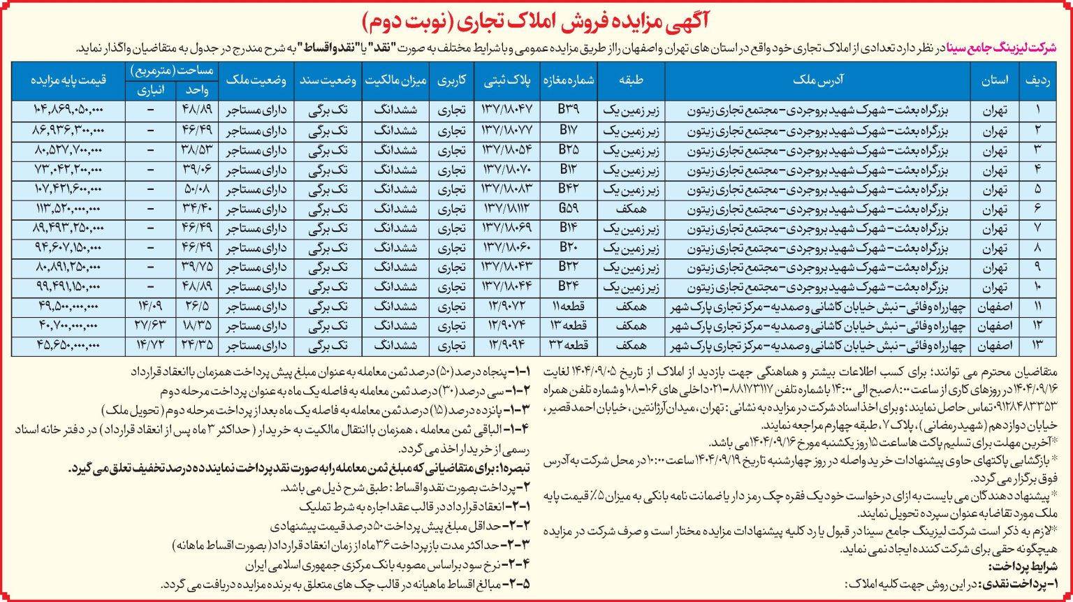 آگهی مزایده فروش املاک تجاری(نوبت دوم)